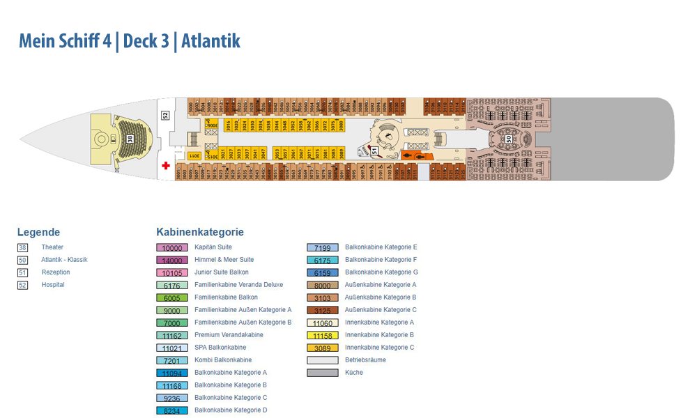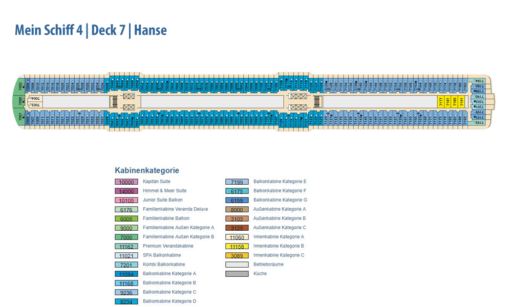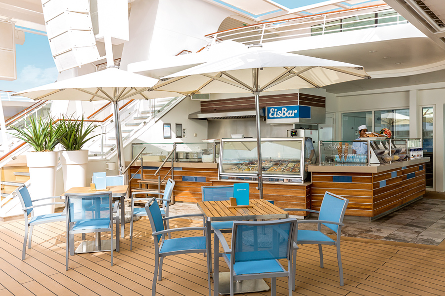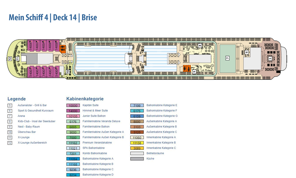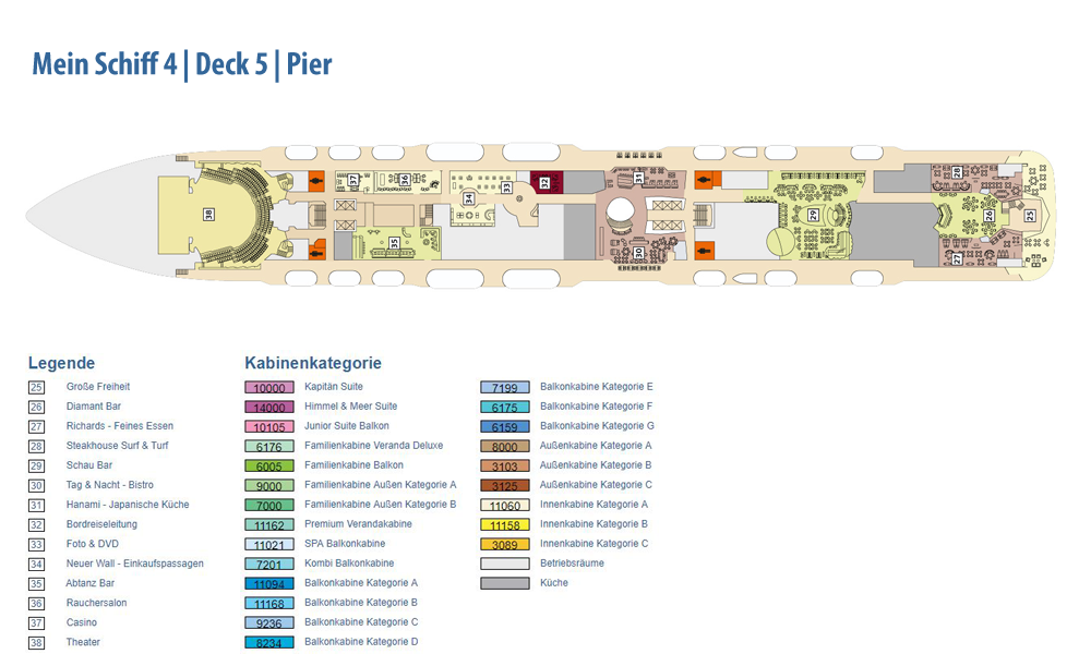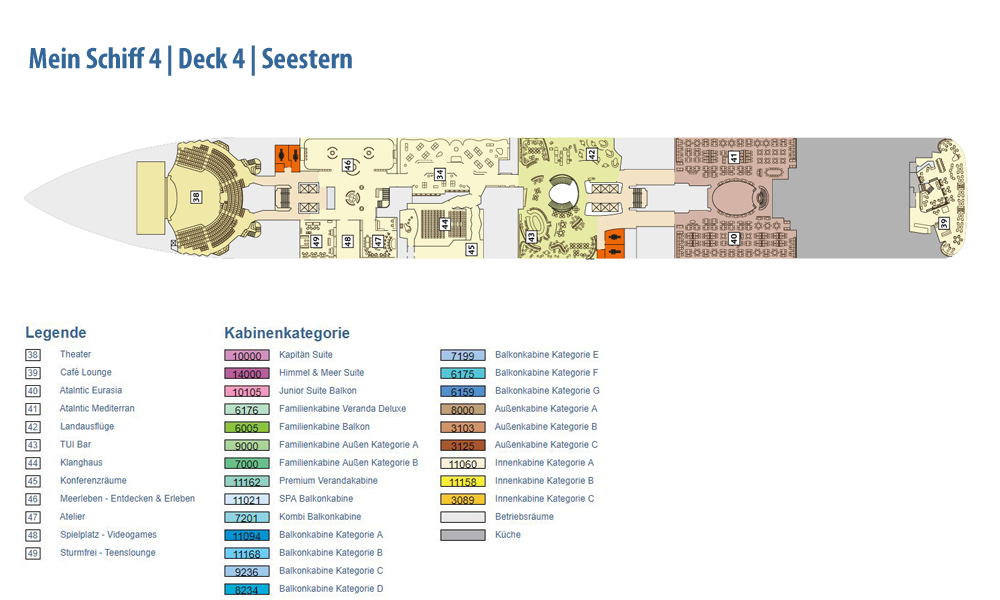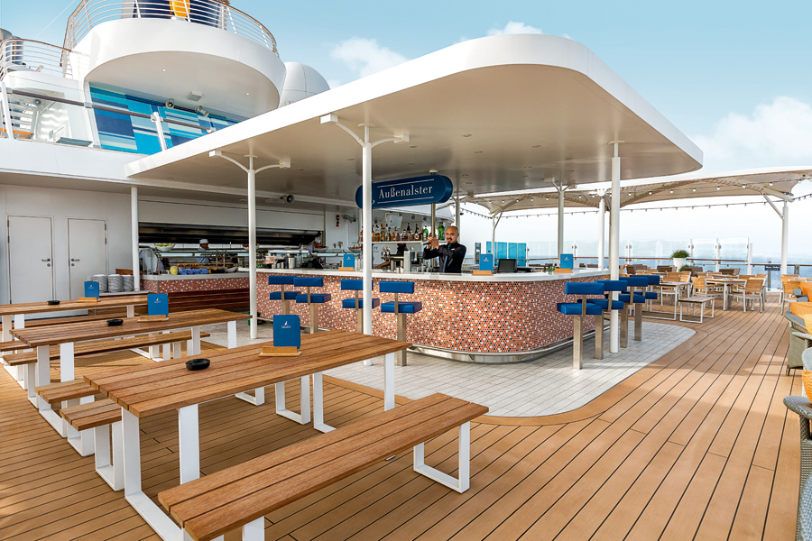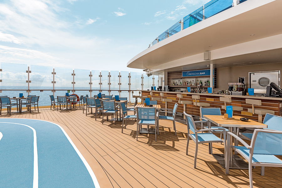 Highlights des neuen Wohlfühlschiffs: Die Mein Schiff 4 verfügt über insgesamt 1.253 Passagierkabinen, 90 Prozent davon sind Außenkabinen, 82 Prozent der Kabinen sind mit Balkonen ausgestattet. Durch die große Vielfalt von Kabinenkategorien, darunter Kabinen für Familien und SPA-Fans, wird bestens auf die individuellen Bedürfnisse und das Wohlbefinden der Gäste an Bord eingegangen. Besonders viel Platz bieten die Himmel & Meer Suiten, die sich über zwei Ebenen erstrecken und jeweils über eine eigene 29 Quadratmeter große Dachterrasse verfügen. Mit je zwei neuen Diamant Suiten und Themen Suiten bietet die Mein Schiff 4 den exklusivsten Ausblick und Komfort. Bei der Ausstattung der Taufpaten Suite hat Franziska van Almsick mitgeholfen und ihre eigenen Akzente gesetzt. Kulinarik auf höchstem Niveau Das Hauptrestaurant Atlantik ist auch auf der Mein Schiff 4 die Mein Schiff Premium-Inklusivleistungen-Adresse für Genuss mit Service am Platz. Neu ist dabei das À-la-carteRestaurant Atlantik – Brasserie mit Gerichten aus der französischen Küche. Wer es exklusiver mag, nimmt im erweiterten Außenbereich des Surf & Turf Steakhouses Platz und bestellt Grillspezialitäten, die direkt am Tisch zubereitet werden. Mit der Waterkant – Bar & Lounge erweitert TUI Cruises auf der Mein Schiff 4 sein Mein Schiff Premium-Inklusivleistungen-Angebot. Während die maritim angehauchte Bar tagsüber zum Verweilen einlädt, finden die Gäste hier abends eine weitere Location für den Drink vor oder nach dem Besuch von Theater oder Klanghaus. Highlight der Waterkant – Bar & Lounge ist das etwa zehn Meter lange Schiffsmodell der Mein Schiff 4, welche Einblicke in Bereiche wie Maschinenraum und Brücke bietet, die dem Gast sonst verborgen bleiben. Ebenfalls neu auf der Mein Schiff 4 sind das Casino & Lounge, ein mit Rauchersalon und Casino kombinierter Bereich. Der Champagner Treff ist bereits von der Mein Schiff 3 bekannt, er wurde auf der Mein Schiff 4 um einen Innenbereich ergänzt. Hier können die Gäste bei einem Glas Champagner den Ausblick auf das Meer genießen. Dieser exklusive Bereich, mit Platz für bis zu 50 Personen, steht auch für besondere Anlässe wie Hochzeiten, Geburtstage oder Jubiläen zur Verfügung.