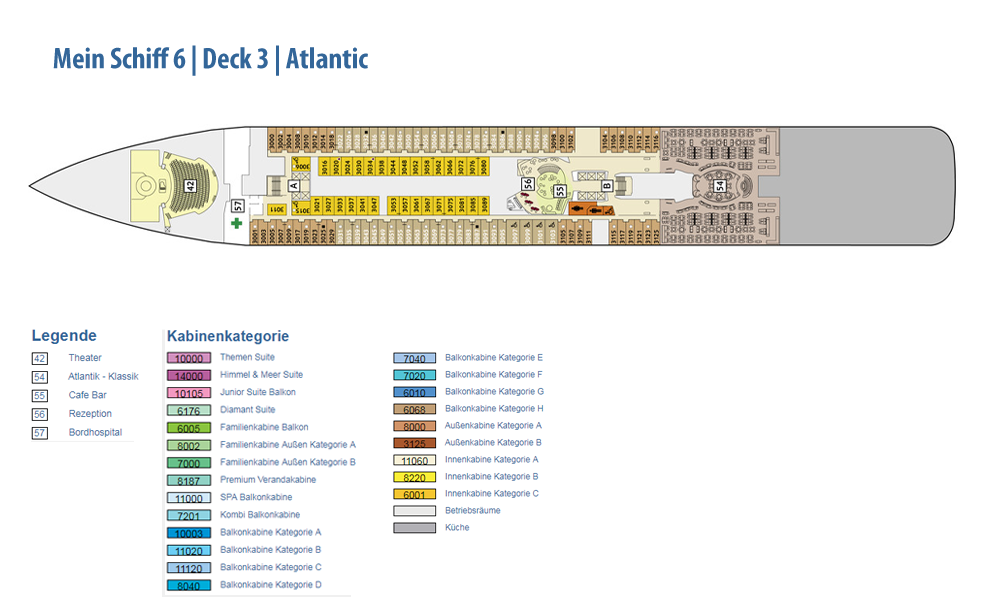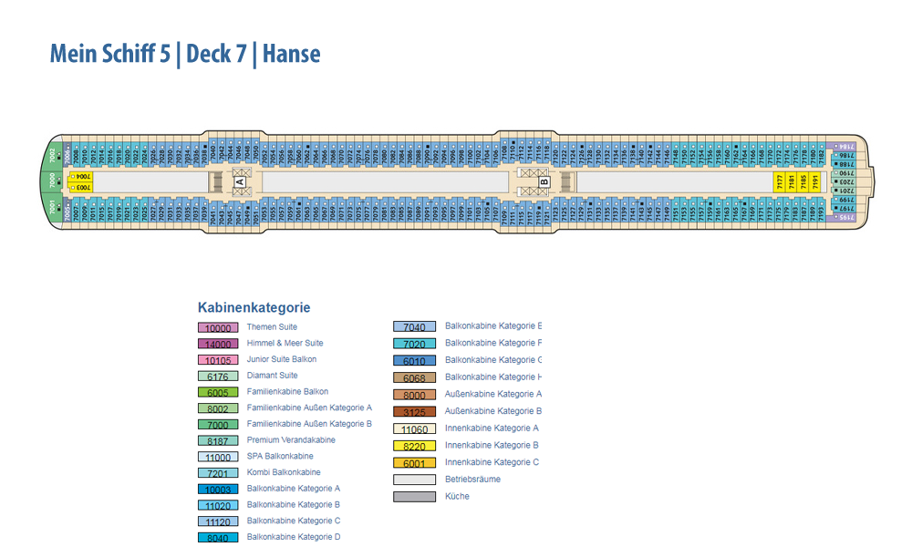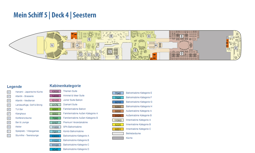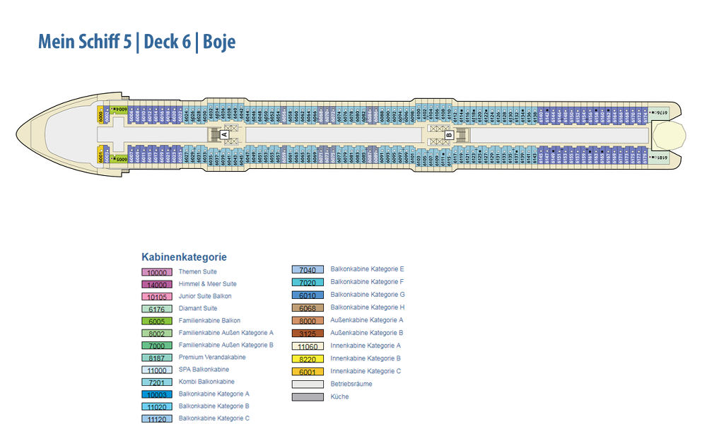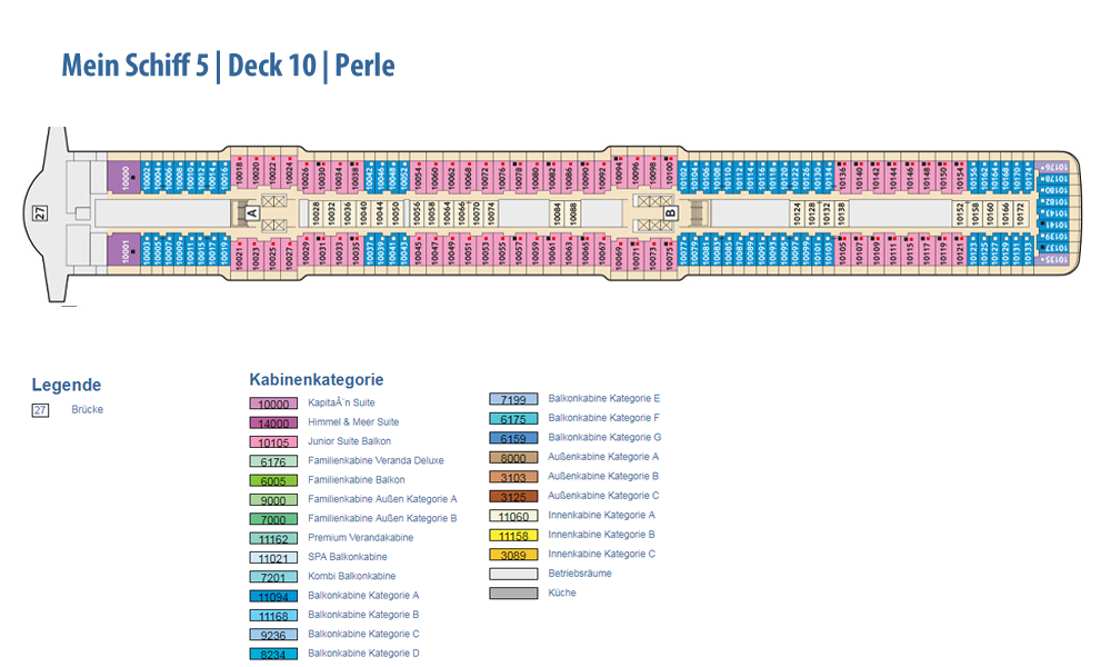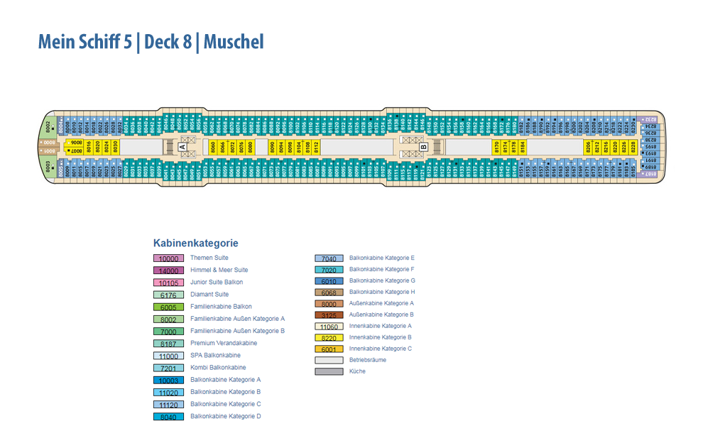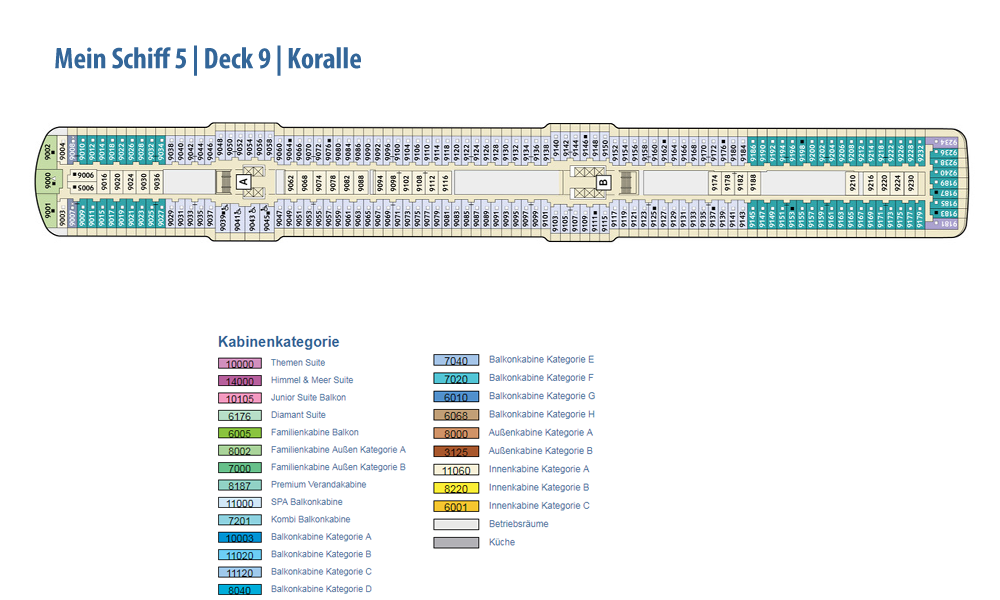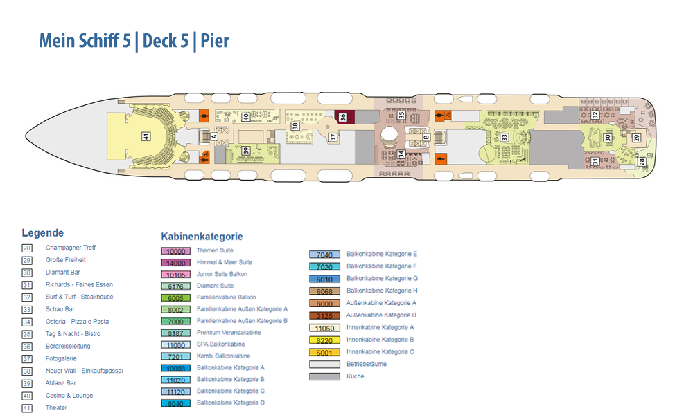 Ausstattung und Passagierkabinen: 1267: 127 Innenkabinen (2 davon barrierefrei), 97 Außenkabinen (4 davon barrierefrei), 963 Balkonkabinen (4 davon barrierefrei), 64 Junior Suiten und 16 Suiten. 13 Restaurants und Bistros, 13 Bars und Lounges, die Fläche des Außendecks beträgt 17.895 m². Himmel & Meer Suiten: Genießen Sie den Luxus einer Dachterrasse in unseren Himmel & Meer Suiten. Auf der Mein Schiff 5 haben wir neben dem Einbau von zwei zusätzlichen Himmel & Meer Suiten auf Deck 14, noch einige kleinere Änderungen vorgenommen. Lassen Sie sich überraschen.